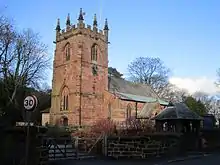 The church is built in sandstone with a slate roof. The tower is in Perpendicular style with a battlemented parapet, crocketted finials and gargoyles. Its west front has a doorway with a three-light window above it. The belfry windows have two lights. The plan of the church consists of a three-bay nave, a chancel, a north vestry and a south porch.[1] In the chancel there is some 14th-century masonry, and the east window dates from about 1375. The windows in the south wall are Perpendicular. The nave had been in the classical style until it was replaced in the 19th century in Gothic revival style.[3]