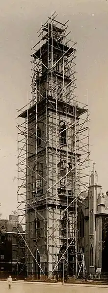 Black and white photograph of St Paul's Church, Portland Square, Bristol, UK from 1926, showing the distinctive tower covered in scaffolding for maintenance and repair. The shot is from the south west of the church, and there is a small blurred figure in the foreground.
