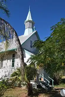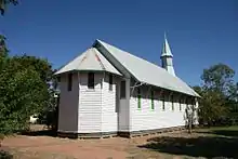 St Peter's Anglican Church is located on the southern side of Elm Street and is parallel to the road, running on an east-west axis. It is a timber building, rectangular in plan with an apsidal sanctuary at the eastern end. To the western end is a baptistery flanked by small porches. It has a steeply pitched gable roof clad with corrugated iron which extends to cover the vestry on the southern side. The roof is crowned with an octagonal louvred turret and spire and the eaves are supported by curved timber brackets. The external walls are clad in narrow weatherboards. There is a bell tower at the south east corner between vestry and sanctuary.[1]