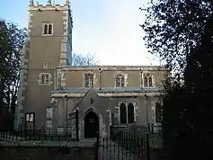 The Church of St. Peter at Farndon[1] "was erected during the reign of Queen Elizabeth, and... consists of chancel, nave with clerestory, a south aisle with an arcade of three bays, a western square tower containing four bells, and with an entrance porch. Portions of Saxon work, perhaps belonging to the first church, are to be found built in the north wall of the nave; the second church is represented by the columns and arches of the south aisle; while the third and present church is chiefly built in the Perpendicular style. The font is an Early English one. The date on the nave roof, which is well constructed, is 1664, and there are two stained glass windows of some merit, one on the south side of the chancel and the other in the aisle. Much interest was taken in an ancient sword, thought to be Saxon, and measuring 2 ft 41⁄2 ins (72 cm) long, which was discovered when excavating under the present church in October, 1892. This "Viking sword from Farndon Church" is now preserved in the church vestry." The sword is thought to represent "evidence of Danish and Viking attacks in the Newark area,"[2] and the sword is illustrated in David Kaye's "History of Nottinghamshire." In recent years, the four church bells have been augmented to six and re-hung.[3]