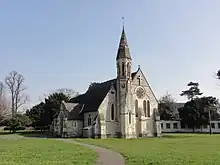 The church building was constructed in 1862 when Whitton separated from St Mary's, Twickenham[4] to become a separate parish. The Gostling family, owners of part of the former estate of the Duke of Argyll, donated land at the junction of Hounslow and Kneller Roads for the new Church and for an adjoining vicarage, since replaced; the architect was F H Pownall.[1] The stained glass windows on the east side of the church are by Clayton and Bell (1862); the window on the west side is by Charles Eamer Kempe (1892).[1] On display in the church is a 15th-century alabaster panel of Christ and Arma Christi, imported from Valle Crucis Abbey, Wales, in 1913.[1]