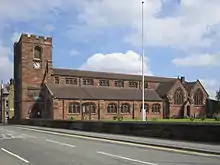 A chapel of ease to St Oswald, Winwick is recorded on the site in 1515; this chapel was rebuilt in 1714.[3] The new chapel, which had a cruciform plan, was consecrated in 1746. It was enlarged in 1782, and again in 1815.[4] This chapel was in Georgian style.[5] The present church was built in 1891–93, and was designed by F. H. Oldham of Manchester, providing seating for about 500 people. The church was consecrated on 6 July 1893 by the Rt Revd J. C. Ryle, Bishop of Liverpool.[6] In 1929–30 the Lancaster architect Henry Paley of Austin and Paley added a new vestry at a cost of £506 (equivalent to £68,000).[7][8] The tower originally had a saddleback roof, but this was removed in the 1960s.[5]