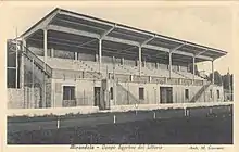 In the 1928–1929 season, the U.S. Mirandolese team reached the first place in group E of the Second Division on equal terms with GS Farini, who was beaten (2-0) in the play-off played in Mantua on 9 June 1929. The victory allowed Mirandolese to play in the Prima Divisione for 3 years. In 1929 construction work began on the spectator stand, designed by architect Mario Guerzoni (1884-1956) and inaugurated in 1930.
