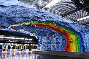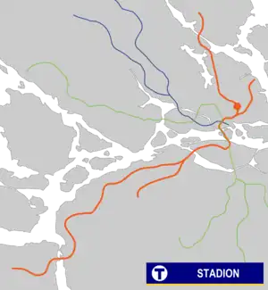 Stadion metro station is on the red line of the Stockholm metro, located near the Stockholms Stadion in the district of Östermalm, Stockholm, Sweden. The station was opened on 30 September 1973 as part of the extension from Östermalmstorg to Tekniska högskolan.[2]