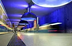 After the Moosfeld station are then only the two stations Messestadt-West and Messestadt-Ost. Directly adjacent to the metro stations is the exhibition grounds to the north and a new residential development to the south, the shopping center Riem Arcaden, as well as the area of the Riemerpark, where the 2005 Bundesgartenschau took place. On the east end of the end station is a special feature: a sundial designed by Blasius Gerg is located on the ceiling, to which its funnel-shaped form brings sunlight downwards.