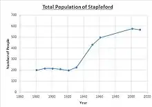 Census reports[10] from 1880s to 2011 have illustrated within the "Total Population of Stapleford" graph that during 1880 to 1920 population growth was reasonably stable within 200 people. Thereafter, population growth increased by more than a half to 500 people by 1960 and then by 2011 increased by less than 100 people to reach the 2011 population of 567 people.