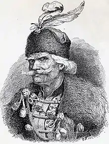 Starina Novak is venerated as a hero in the Serbian epic poetry,[5] as the central figure in poems such as Starina Novak i knez Bogosav, Starina Novak i deli Radivoje, and others. Some poems confuse Starina Novak with an older military commander,[6] Novak Debelić, a nobleman from the 15th century; thus, the character of Starina Novak in epic poetry could be said to include two individuals.[7]