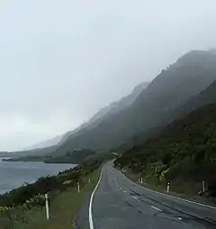 From Hokitika, the highway moves away from the coast, though still generally keeps within five kilometres of the sea. The highway continues south past Ross and Harihari, moving through state forests as it crosses several fast-moving rivers. Seventy kilometres south of Harihari, the highway skirts Lake Mapourika and reaches the tourist settlement of Franz Josef Glacier. The glacier itself, one of two within easy walking distance of the highway, lies nearby in the Southern Alps, which here come very close to the Tasman coast. The second glacier, Fox Glacier is located some 20 kilometres further south. The highway again briefly touches the coast at Bruce Bay before heading inland past Lake Paringa, before reemerging on the Tasman coast at Knights Point. The 30 km stretch of highway from here south to Haast is noted for its rugged scenery. After crossing the Haast River, the highway turns eastward and inland up the river's valley, climbing past the Gates of Haast and crossing the 563-metre Haast Pass, the southernmost of the three main road passes across the Southern Alps.