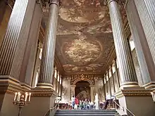 In the crypt of St Paul's, Nelson's body was interred below an elaborate black marble sarcophagus, which had been originally been commissioned for Cardinal Thomas Wolsey, then appropriated by King Henry VIII for himself, but not used.[41] There was a public outcry when it emerged that the four vergers at St Paul's were charging the public a shilling each to view Nelson's tomb, pocketing as much as £300 a day between them. The funeral car was taken to St James's Palace, where it attracted such large crowds that had to be moved to Greenwich Hospital.[42]