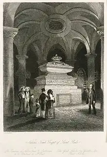 Although Westminster Abbey had traditionally been the resting place of national worthies, by the start of the 19th-century there was very little space left for the sort of grand monument to Nelson envisaged by the government. In 1793, the Dean and Chapter of St Paul's had finally been coerced into accepting secular monuments into the cathedral, which they had previously opposed on theological grounds.[14] Accordingly, Lord Hawkesbury, the Home Secretary, wrote to the king suggesting St Paul's as an appropriate venue for the funeral: