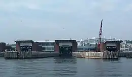 Immediately after the September 11, 2001, attacks, Staten Island ferryboats were used to evacuate attack victims from the World Trade Center.[144][145] The line was then temporarily closed for a week,[146] with ferry service restored by September 18.[147] When it reopened, some ferries were diverted to Bay Ridge due to the closures of subways and roads across the East River. This continued into 2002, by which time some 2,200 passengers per day were using the ferry, and continued to do so even after the subways and highways were reopened.[148] As a result of the Maritime Transportation Security Act of 2002, all vehicular traffic on the ferry was banned in 2003, and passengers were no longer allowed to board from the lower level of either terminal. Passengers had to board and depart from different sections of the ferry; each terminal's lower level was used by departing passengers, which required boarding passengers to use the upper level.[149] This made boarding the ferry inconvenient for park-and-ride users at the St. George Terminal.[150]