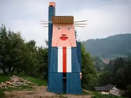 A statue of the 45th U.S. President Donald Trump was erected on private land in Sela pri Kamniku, Slovenia, in 2019.[1] The approximately 25-foot (7.6 m) wood monument depicted Trump wearing a blue suit and a red tie, with a fierce expression and his right arm raised in a fist.[2] A mechanism inside the statue allowed the mouth to open, revealing sharp teeth. Tomaz Schlegl, the artist behind the project, said that "Like all populists, the statue has two faces."[3]