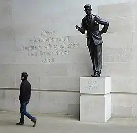 The wall behind the statue is inscribed with George Orwell's words "If liberty means anything at all, it means the right to tell people what they do not want to hear", from an unused preface to Animal Farm.[3] The head of BBC history, Robert Seatter, said of Orwell and the statue that "He reputedly based his notorious Room 101 from Nineteen Eighty-Four on a room he had worked in whilst at the BBC, but here he will stand in the fresh air reminding people of the value of journalism in holding authority to account".[1]