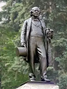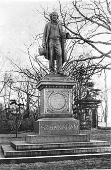 The bronze statue stands atop a pedestal consisting of Knoxville marble and pink granite and is located near the park entrance at the intersection of Flatbush Avenue and East Drive.[5] The pedestal stands atop four receding steps.[6] Stranahan, dressed in normal attire for the era including a bow tie, frock coat, and waistcoat, stands with his left foot forward, with his right arm holding a top hat by his side and a cane and topcoat in his left.[4] The following inscription is carved into the front of the pedestal: "JAMES S. T. / STRANAHAN / A CITIZEN OF BROOKLYN / HONORED FOR MANY / NOBLE SERVICES MOST / GRATEFULLY AS CHIEF / FOUNDER OF / PROSPECT PARK / 1891 [–] LECTOR SI / MONUMENTUM / REQUIRIS / CIRCUMSPICE [–] STRANAHAN". (The Latin phrase translates to "Reader, if you seek my monument, look about you" and was taken from the tomb of Christopher Wren, architect of St. Paul's Cathedral.[6]) Additionally, the rear of the pedestal reads "ERECTED BY HIS / FELLOW CITIZENS / DURING HIS LIFETIME / AND UNVEILED IN HIS PRESENCE JUNE VI – MDCCCXCI". Near the base of the statue on its rear are the foundry marks.[3]