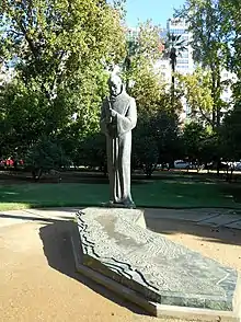 A statue of Junípero Serra in Capitol Park, near the California State Capitol, in Sacramento, California, was installed from 1967 until 2020.[2][3] The statue was put in storage after demonstrators toppled it during a racial justice protest. In August 2021, legislators pass a bill to replace the statue with a monument to local Indigenous nations. The bill needs the signature of the governor to become law.[4]