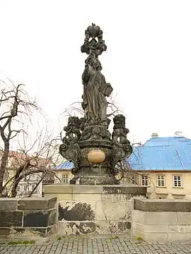 The statue of Saint Cajetan (Czech: Socha svatého Kajetána) is an outdoor sculpture by Ferdinand Brokoff, installed on the north side of the Charles Bridge in Prague, Czech Republic.