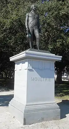 The monument consists of an 8-foot (2.4 m) statue of Moultrie atop a 9-foot (2.7 m) granite pedestal.[3] The front of the pedestal bears the inscription "MOULTRIE", while the other three sides contain inscriptions of the names of the organizations responsible for the monument's creation and a brief biography of Moultrie's life. Beneath the biography is the date of the monument's dedication, "June 28, 2007".[5] The statue faces Charleston Harbor and depicts Moultrie with his hat in his hand and his sword in his sheath.[3]