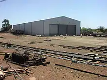 In the early days of the society, Australian National, which managed the railway facilities and operations at Peterborough, allowed rolling stock to be stored within its 19-stall roundhouse. The society saw the need to establish its own facilities, and proposed to establish its own depot on a block of land 200 m (220 yards) north of the boundary of the railways site holding the workshops and roundhouse.[note 1] Members saw it as an ideal site, since it had mains water, power and sewerage. The society also proposed that a triangle could be installed, and Australian National agreed to provide the land at a nominal rent.[19] Despite the proposal, it was not approved and a greenfield site 600 metres (660 yards) west of the roundhouse was allocated by the council.[note 2] Construction of a depot started in 1980.[20] The substantial task of laying track to connect the depot to existing track was completed in 1983.[21]