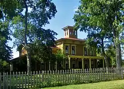 The two-story wood-frame house is in the Italianate style. The north end originally featured a belvedere, but this was removed in 1920. Windows on the north and east ends of the house feature pediments. The main door and its transom are original. The Italianate porches were removed in 1962 and replaced with smaller porches, but a replica was installed in the 1980s. The interior is largely intact. Changes to the interior include modern plumbing, two additional bathrooms on the second floor, and a renovated kitchen.[1]