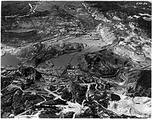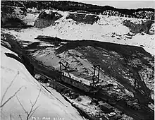 During World War II, a program was implemented to drain the lake.[4] This diversion of the river allowed open-pit mining of hematite iron ore under the middle arm of the lake by Steep Rock Iron Mines Limited and the East arm was mined by Inland Steel Company through its subsidiary Caland Ore Company Limited. By 1949, the site was producing a million tons of ore per year and had an estimated 500 million tons of ore deposits.[5][6][7][8]