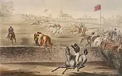 The steeplechase originated in Ireland in the 18th century as an analogue to cross-country thoroughbred horse races which went from church steeple to church steeple, hence "steeplechase". The first steeplechase is said to have been the result of a wager in 1752 between Cornelius O'Callaghan and Edmund Blake, racing four miles (6.4 km) cross-country from St John's Church in Buttevant to St Mary's Church (Church of Ireland) in Doneraile, in Cork, Ireland.[1] An account of the race was believed to have been in the library of the O'Briens of Dromoland Castle. Most of the earlier steeplechases were contested cross-country rather than on a track, and resembled English cross country as it exists today. The first recorded steeplechase over a prepared track with fences was run at Bedford in 1810, although a race had been run at Newmarket in 1794 over a mile (1600 m) with five-foot (1.5 m) bars every quarter mile (400 m).[2] and the first recorded steeplechase of any kind in England took place in Leicestershire in 1792, when three horses raced the eight miles from Barkby Holt to Billesdon Coplow and back.[3]