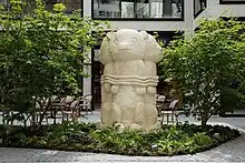 For his figurative stone sculptures Rinck uses traditional tools and techniques of direct carving.[3] He works with sandstone, limestone, marble and diabase. He finds his sources of inspiration in various epochs in particular the French Romanesque period as well as popular culture such as video games and comics.[4][5] Rinck's stone figures build a community of characters, animals, monsters and hybrid creatures endowed with symbols and cultural attributes. He uses examples from history, myths, religion and folklore as reference material[6] and places them in a contemporary context. He often deals with the issues of collective unconscious. The art theorist Bazon Brock states, Rinck adopts the figurative forms of expression of culturally collective fantasies remaining his independent language.[7] One of the key elements of his language is the humorous expression whose lightness stands in contrast to the materiality of the stone.[8] The humor has a liberating effect and helps the viewer to experience the unconscious. The cross-cultural and trans-historical communication qualities allow Rinck's sculptures to achieve universalizing ends, claims curator Daniel S. Palmer.[9] In 2019, Stefan Rinck was featured in the Thames & Hudson publication 100 Sculptors of Tomorrow. The documentary Heart of Stone by Sonja Baeger which pictures the production of Rinck's three monumental-in-size sculptures was premiered in 2021 in Berlin.