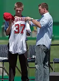 Strasburg (left) receiving a Nationals uniform from Ryan Zimmerman, August 2009