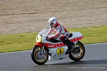 Baker's good results earned him a factory sponsored ride with the Yamaha factory team for the 1977 season.[3] The 1977 season marked the debut of the Formula 750 World Championship beginning with the Daytona 200.[5] Baker traded the lead with Kenny Roberts several times before he prevailed to win at Daytona.[3][12][13] He finished second to Roberts at the Imola 200, then won in France, Austria and Belgium to win the 1977 Formula 750 title. He also finished second to Barry Sheene in the 500cc world championship.[14][15]