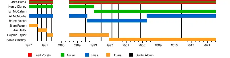 After six years and four albums, they split up. They re-formed five years later, in 1987. Despite major personnel changes, they are still touring and recording. In 2014, the band released their tenth studio album and a world tour followed its release. Jake Burns, the lead singer, is the only member to have been with the band during all its incarnations, but in March 2006, original bass guitarist Ali McMordie rejoined them following the departure of bass player Bruce Foxton after fifteen years.