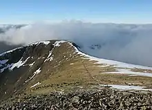 Stob Ghabhar's other notable geographical features are its corries and cliffs. Coire Dhearbhadh which stands on the mountain's eastern flank is ringed by sheer cliffs and contains the small lochan, Coirein Lochain. The steep headwall of this corrie contains the upper couloir, a deep gully which provides a tough scrambling route to the summit in summer and a classic ice route in winter which was first climbed in 1897.[4] The summit stands on the edge of the cliffs overlooking the corrie.