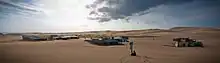 In the late 19th century shipwrecks on Stockton Beach were so common that two tin sheds were constructed on a part of the beach in what is now Bobs Farm near Salt Ash to hold provisions for shipwrecked sailors.[11] During the Great Depression of the 1930s a group of squatters constructed a series of tin shacks at the site which is approximately 11 km (6.8 mi) south west of Anna Bay.[12][13] During World War II the shacks were torn down to make way for an Army camp.[9] Today, eleven of the shacks, known collectively as "Tin City", remain but no new shacks may be built, nor can existing shacks be rebuilt if they are destroyed by the elements.[9] Tin City and the beach's sand dunes were used for several scenes in the 1979 movie Mad Max.[11][12][14][15][16]