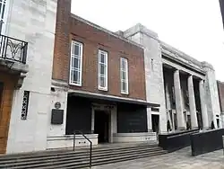 The new building was designed by John Reginald Truelove and was completed in 1937.[1] The design involved a symmetrical curved frontage of fifteen bays forming municipal offices built in the Renaissance style to the west; this section, which contained the council chamber, featured a central section which was recessed with a doorway on the ground floor and a balcony and window on the first floor flanked by two huge Doric order columns.[1] This arrangement was complemented by a rectangular assembly hall with four huge Doric order columns flanked by pavilions built in the Classical style to the east.[1] A sprung Canadian maple dance floor installed in the assembly hall allowing it to be used as a dance facility.[3]