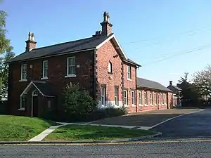 Besides the main station buildings, which were on the eastbound platform, there was a signal box, the stationmaster's house, the house for the signalman and four workers cottages set in an "L" shape with a communal courtyard.[13] The goods shed which was built in between 1857 and 1858 still stands.[14] The goods sidings and coal depot were located on the northern side of the line.[15] Fresh water was piped from a spring near to Battersby station with the pipe being laid between the two railway tracks.[16]