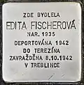 HERE LIVED EDITA FISCHEROVÁ BORN 1935 DEPORTED 1942 TO THERESIENSTADT MURDERED 8.10.1942 IN TREBLINKA |