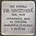 HERE LIVED EVA ORNSTEINOVÁ BORN 1938 DEPORTED 1942 TO THERESIENSTADT MURDERED 18.12.1943 IN AUSCHWITZ |