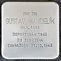 HERE LIVED GUSTAV MANDELÍK BORN 1868 DEPORTED 1942 TO THERESIENSTADT MURDERED 31.10.1942 |