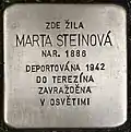 HERE LIVED MARTA STEINOVÁ BORN 1886 DEPORTED 1942 TO THERESIENSTADT MURDERED IN AUSCHWITZ |