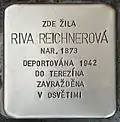 HERE LIVED RIVA REICHNEROVÁ BORN 1873 DEPORTED 1942 TO THERESIENSTADT MURDERED IN AUSCHWITZ |