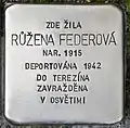 HERE LIVED RŮŽENA FEDEROVÁ BORN 1915 DEPORTED 1942 TO THERESIENSTADT MURDERED IN AUSCHWITZ |