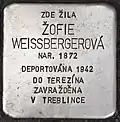 HERE LIVED ŽOFIE WEISSBERGEROVÁ BORN 1872 DEPORTED 1942 TO THERESIENSTADT MURDERED IN TREBLINKA |