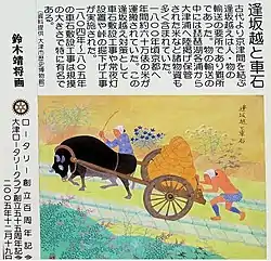 An ox-drawn cart on the stone route over the Osaka mountain pass (逢坂峠) of the Tokaido Highway (From the stele erected at Ōtsu Station Plaza.