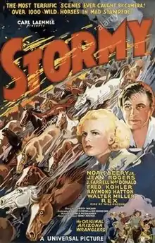 Stormy is a 1935 American western drama film directed by Lew Landers, written by Ben Grauman Kohn and George H. Plympton, and starring Noah Beery, Jr., Jean Rogers, J. Farrell MacDonald, Raymond Hatton, Walter Miller and Fred Kohler.[1][2][3] It was released on October 22, 1935, by Universal Pictures.