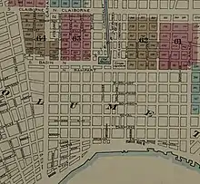 Though developed under the proposed title The District, the eventual nickname Storyville originated from City Councilman Sidney Story, who wrote the legislation and guidelines to be followed within the proposed neighborhood limits. The thirty-eight block area was bounded by Iberville, Basin Street, St. Louis, and N. Robertson streets.[2] His vision came from port cities that legalized prostitution and was officially established on July 6, 1897. For decades most of this former district was occupied by the Iberville Housing Projects (mostly demolished), two blocks inland from the French Quarter.