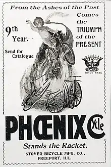 The company was founded by Stover in 1889, and the first year they produced 320 bicycles (also known as Wheels) and they had 6 employees.[1] D.C. Stover was the owner of the company and several other companies with the moniker Stover. The company produced bicycles under the name Phoenix. They were one of the early manufacturers of the Safety bicycle.[2]