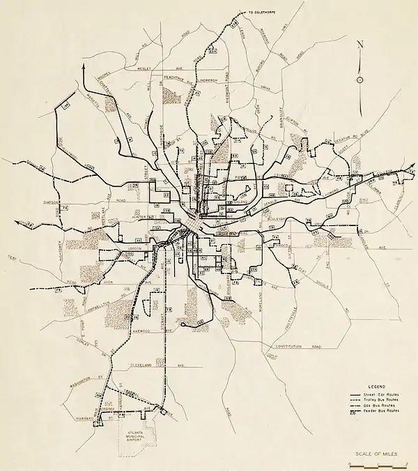 The first such transportation began with horsecars in 1871, and electric streetcar service started in the 1880s.[1] In addition to streetcars in Atlanta proper, there were also interurban railways from Atlanta to outlying towns. The last streetcar service on the old network ended in 1949; the streetcar system was quickly replaced by a trolleybus system and with buses.