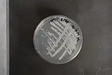 Streptomyces antibioticus was discovered by Selman Waksman and H. Boyd Woodruff, who named the bacterium Actinomyces antibioticus.[2] In their 1941 publication, Waksman and Woodruff describe their use of the "bacterial-agar plate method", in which they mixed a suspension of E. coli with washed agar containing 1.5% NaCl and 0.5% K3PO4.[2] To this blend, they added "fresh field or garden soil" that was diluted with sterile tap water, and plated their final mixture.[2] They concluded that "bacterial antagonists", that is, antibiotic producing organisms, would produce clear patches in the agar.[2] Through this method they isolated and characterized Actinomyces antibioticus.[2] Two years later, Waksman renamed the organism Streptomyces antibioticus.[3]