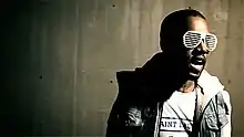 West and his entourage got no permits to film, simply having interpreters explain the situation to locals.[74] The clip features shots of a real-life riot of a Japanese politician; it took place directly outside of Williams' hotel, and West encouraged the director to go out and film it. West was not satisfied when going over the footage back in the United States, he spent ten weeks in editing suites editing the video.[74] He decided to abandon the storyline and choose a video with "the hottest shots possible," going to New York for additional filming at the Jacob K. Javits Convention Center. Williams was unable to film additional footage, with the video already extensively over-budget, so West hired a local team. The video's most famous shots were filmed in New York,[74] and feature West wearing a pair of Alain Mikli shutter shades, which he requested from the designer specifically for the video.[75] Dissatisfied with the footage of said shots, due to the director of photography not being the same as Williams' DOP, West distorted the footage to resemble what it might look like as if it were broadcast over a cathode ray tube television set.[74] Further pickup shots were filmed in Los Angeles, including segments featuring Daft Punk, who were coincidentally in L.A. at the time and attended the video shoot.[74] Williams explained that the video was West's vision saying, "He's a strong filmmaker in his own right, a very well-respected and strong filmmaker in my book. He really did a great job executing his vision. I was kinda his co-partner on this one."[71]