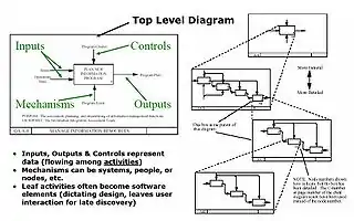 Structured analysis typically creates a hierarchy employing a single abstraction mechanism. The structured analysis method can employ IDEF (see figure), is process driven, and starts with a purpose and a viewpoint. This method identifies the overall function and iteratively divides functions into smaller functions, preserving inputs, outputs, controls, and mechanisms necessary to optimize processes. Also known as a functional decomposition approach, it focuses on cohesion within functions and coupling between functions leading to structured data.[11]