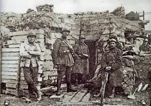There were two important Belgian positions north of Diksmuide. Dodengang, a system of trenches where the Belgian and German armies were only meters away, was just north of Diksmuide, on the Yser. Next was Onze-Lieve-Vrouwehoekje ("the little corner of Mary"), at Out-Stuivekenskerke, a little over 1 kilometer from the Yser; because of the flooding, this had become an island.[1] This important Belgian outpost ("The Great Guard South") was manned from December 1914 to May 1915 by the artillery observer Edouard Lekeux (Aarlen, 1884 - Luik, 1962[4]), a reserve lieutenant and a Franciscan minorite, who moved to the Goemaere family farm after German artillery had leveled the church tower.[5] A plaque in his honor was put up in 1963 in Oud-Stuivekenskerke.[4] The Germans retreated from the area on October 15, 1918.[1]