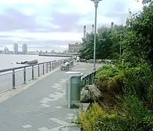 Located on the what was once the brownfield site of a former ready-mix concrete plant and a parking lot, the park was created after the failure of the proposed Riverwalk mixed-use development that would have included residential units, offices, a hotel and a marina.[3] Surplus concrete dumped from trucks into the East River has created a small beach in the middle of the park near the end of 20th Street, which is not intended to be accessed by pedestrians.[4][5][6]
